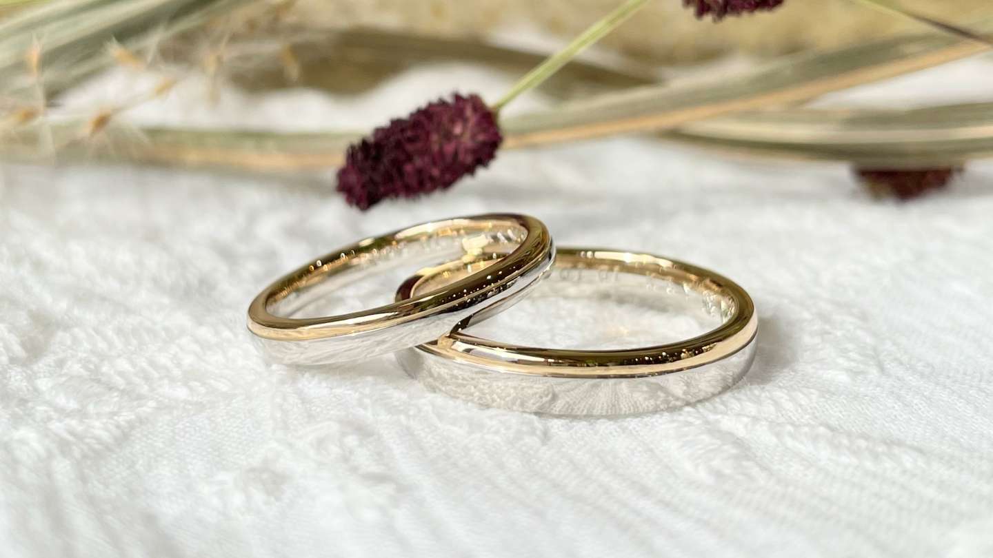 オーダーでお作りした結婚指輪。 プラチナにゴールドが重なったデザインでそれぞれの金属の美しさが際立つ鏡面仕上げ。 重ね付けをしているような、ゴールドに縁取られているような、シャープな印象の美しい結婚指輪です。