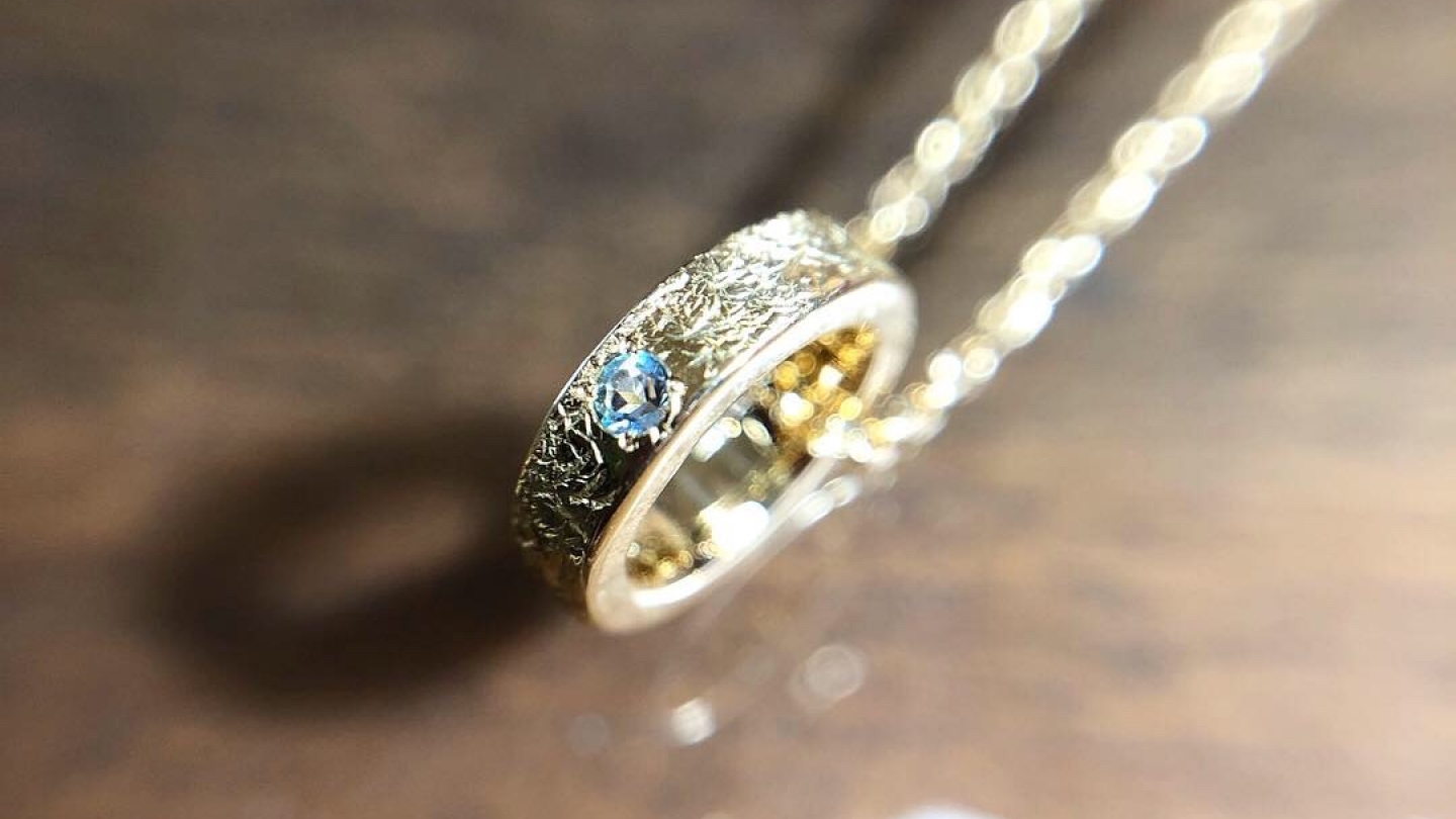 結婚式でのサプライズに花嫁さまへのプレゼントジュエリーをご制作。 一緒に流すムービーの撮影にお友達もご同行されました。 奥様のK18イエローゴールドのベビーリングをお作りいただき誕生石を石留め。 結婚記念日を側面に刻印してペンダントトップに。飽きのこないシンプルなデザインで日常使いしやすく、ずっと使っていただけるジュエリーです。