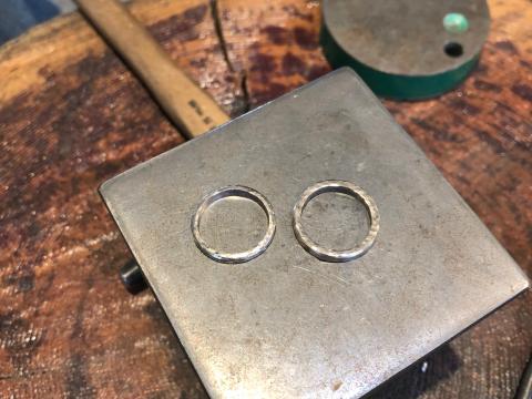 ツチメの結婚指輪をお作りいただき、誕生石をそれぞれお留めいたしました。 側面までぐるりとツチメを打った、手作り感あるゴツゴツとした雰囲気ある指輪。 3つ並んだ誕生石が家族を表すようで、とても素敵な指輪です。