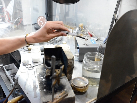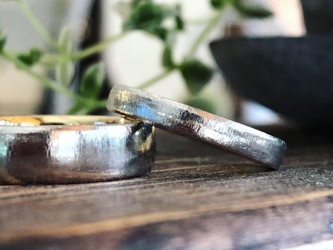 外側がプラチナ900、内側がK18イエローゴールドのコンビネーションのリング。 男性様は太めのリングがお好みで4mm幅の存在感あるお作りです。 外側の仕上げは普段は磨き途中に使う特殊な道具を使って、メラメラと光る珍しい仕上がり。 平打ちリングの角を丸くした平甲丸のリング形状でぽってりとした優しい雰囲気のリングです。